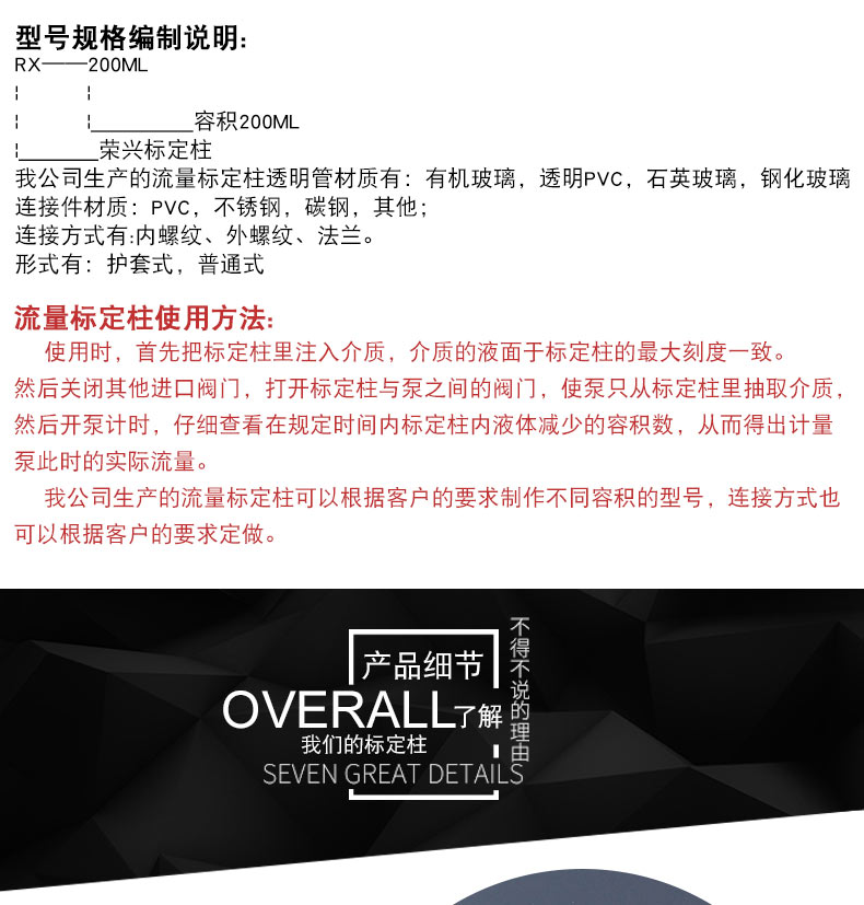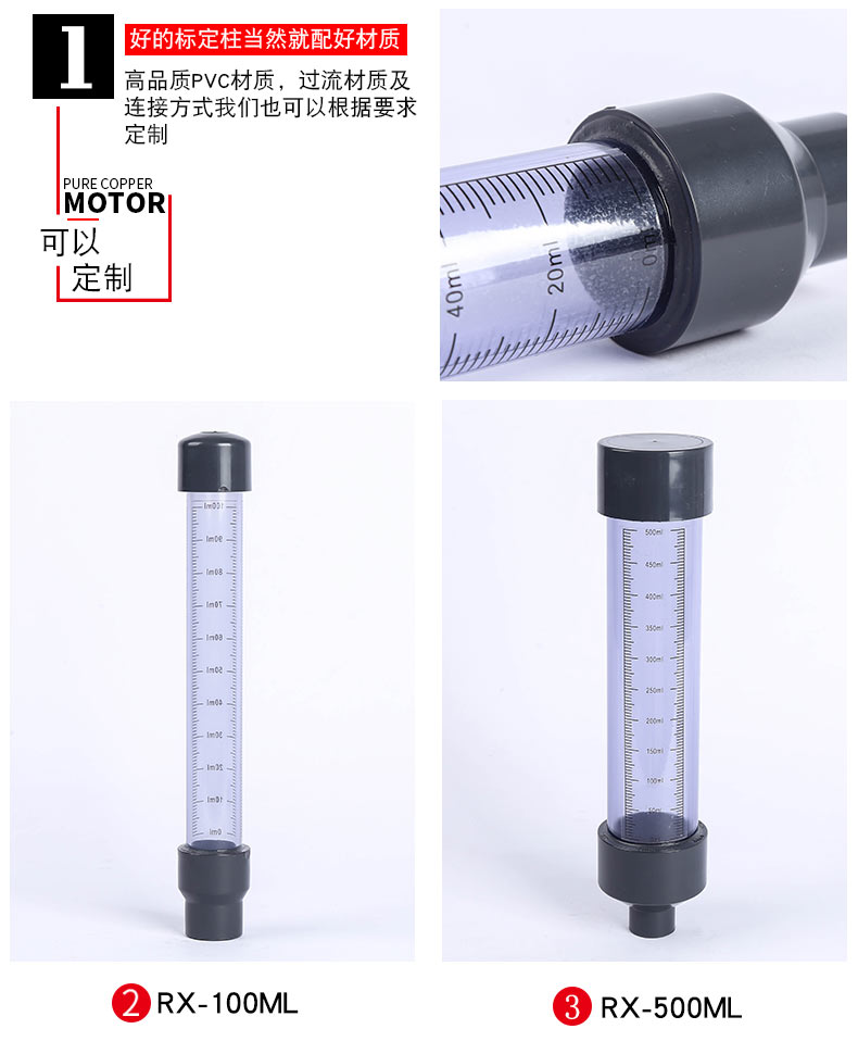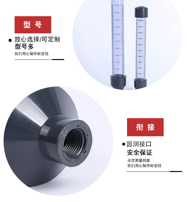 我公司生產的流量標定柱透明管材質有:有機玻璃,透明PVC, 石英玻璃(小容積);
