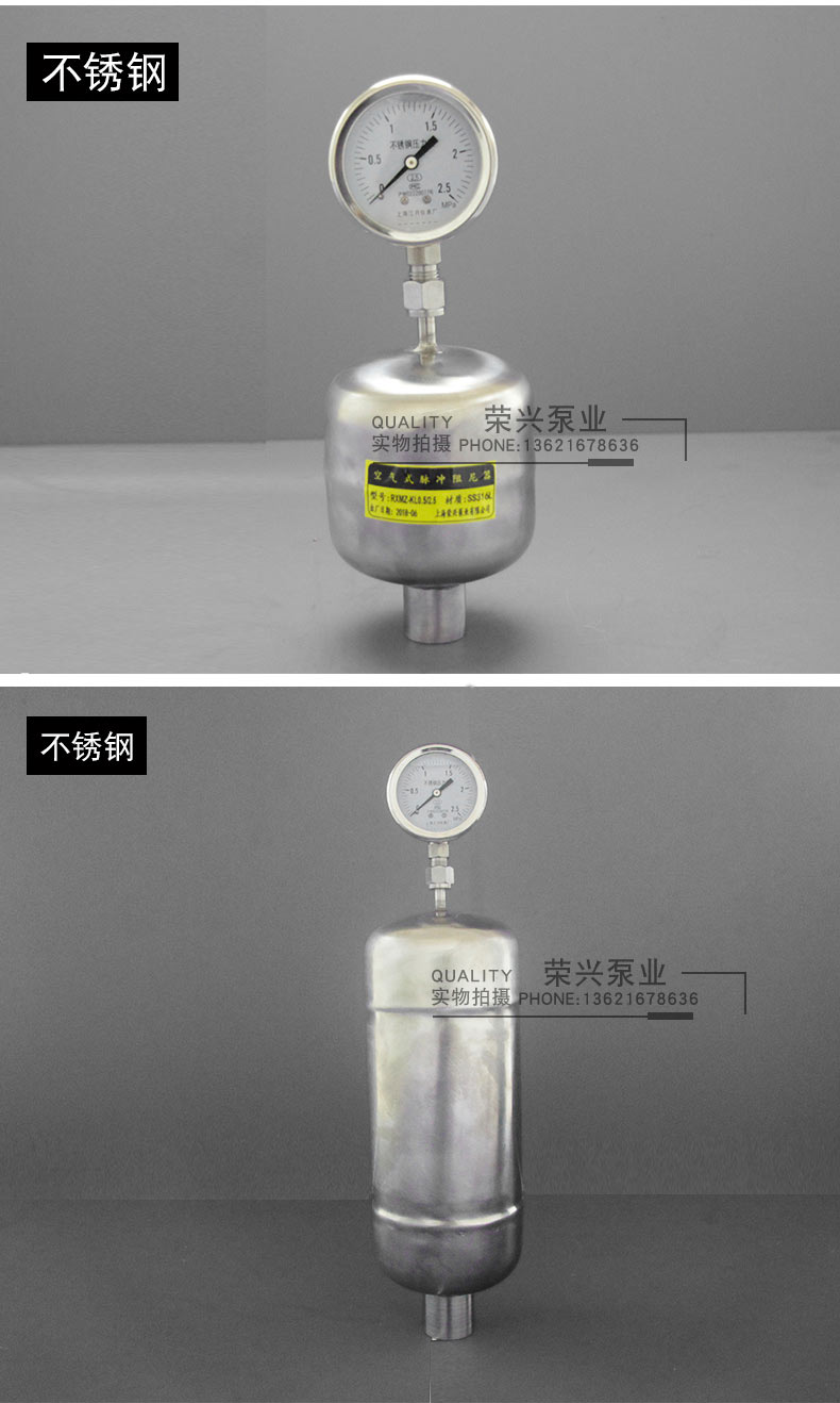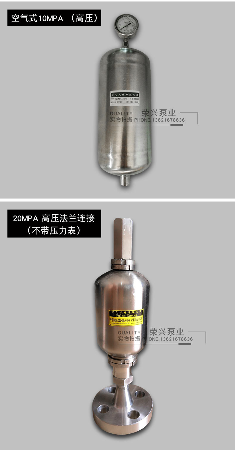 空氣式脈沖阻尼器是一個密封的罐體,依靠液體直接壓縮罐內的空氣起到緩沖的效果。空氣式阻尼器最大的弊端就是里面的空氣會逐漸溶解到輸送介質中,導致可壓縮的空氣越來越少,能起到緩沖的作用也隨之減小,需定期將阻尼器從設備上拆卸后排空里面的介質,保證內部的空間,所以在使用過程中維護稍顯麻煩。但是其價格相對低廉,所以適合一些對緩沖要求不是太高的系統使用。