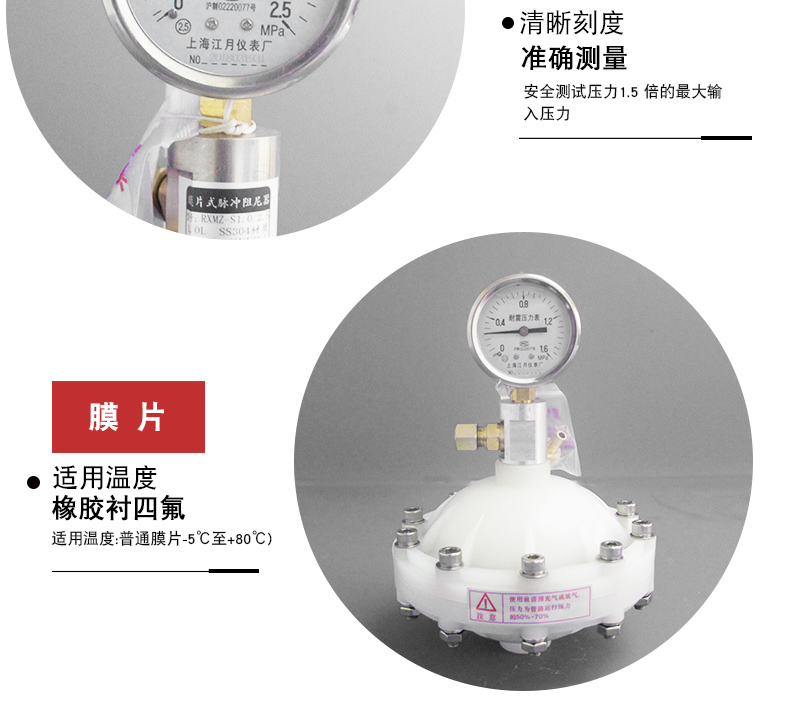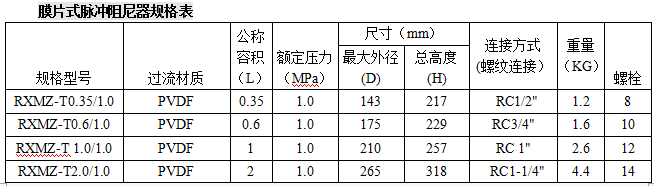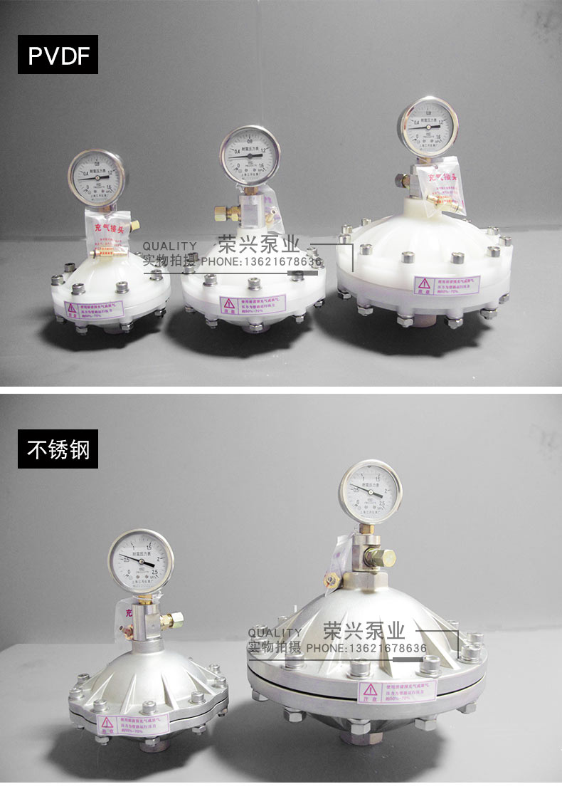 膜片式脈沖阻尼器分為上下殼體,中間由聚四氟乙烯&橡膠復合膜片分隔,是最常用的脈沖阻尼器。最大的優點就是隔膜將預充氣體和管路中的液體分開,方便維護,在合適的選型、充壓條件下,能夠減少絕大多數的脈沖。我公司生產的膜片式脈沖阻尼器PVC材質的最大耐壓為1.0MPa,不銹鋼材質最大耐壓一般為2.5MPa,最高耐壓5.0MPa。