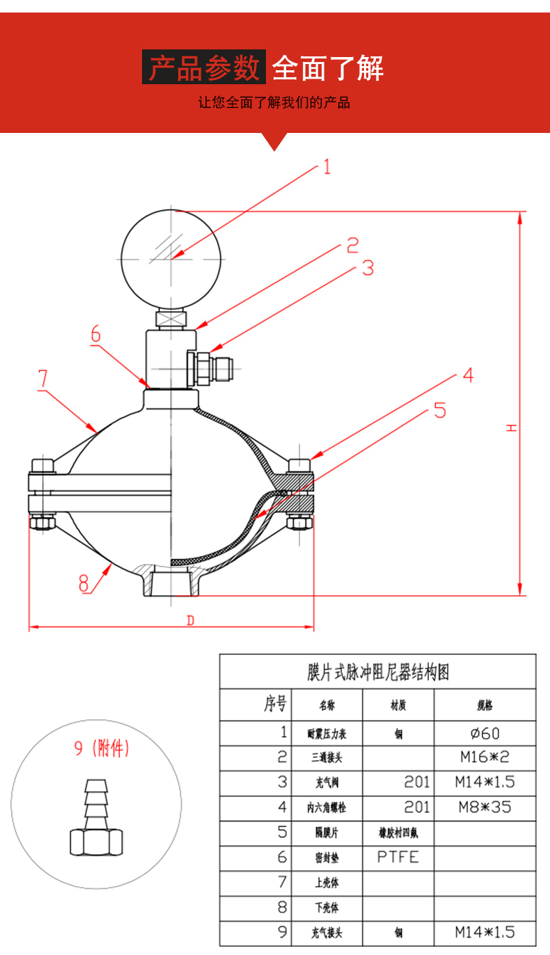 1、 膜片式脈沖阻尼器的容積、材質、連接方式(或提供泵的流量、壓力、介質、材質,由我公司為您提供精確選型)